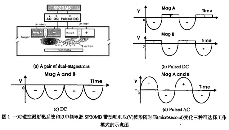 在每半個(gè)脈沖周期中。磁控對(duì)靶中的一個(gè)處于負(fù)電位的磁控靶作為濺射陰極,如MagA,而另—個(gè)磁控靶作為陽極,如MagB。磁控靶電壓在另半個(gè)周期中方向轉(zhuǎn)換。瞬間陰極生成的二次電子在電場(chǎng)作用下加速向陽極移動(dòng),并中和在陽極表面積累的正電荷。非對(duì)稱雙極脈沖DC模式的波形示意圖示于圖1b。在這種情況下,在固定的“占位”期間,磁控靶在正常工作電壓(正常范圍為-400v至-600V)下進(jìn)行濺射。占位時(shí)間可以進(jìn)行設(shè)置,使在靶中毒(電荷積累過多)區(qū)域的電荷釋放不至于引起擊穿和起弧。由于磁控靶電位在下半個(gè)周期中轉(zhuǎn)變成為相對(duì)正值,積累負(fù)電荷在“空位”期間通過等離子體進(jìn)行釋放。由于電子質(zhì)量比相應(yīng)離子質(zhì)量小很多,在等離子體中的電子移動(dòng)速度要比離子移動(dòng)速度快很多,在空位期間靶電壓反向成為正常占位電壓的10%,電源的空位時(shí)間為12.5us(即整個(gè)脈沖周期的50%)。連續(xù)DC模式的波形示于圖lc,磁控靶A和B的電壓是相同的正弦波形,且磁控靶A和B的相位差是半個(gè)周期。雙極脈沖AC模式的波形示于圖1d,和圖1c類似,磁控靶A和B的電壓是相同的雙極脈沖正弦波形,且磁控靶A和B的相位差是半個(gè)周期。