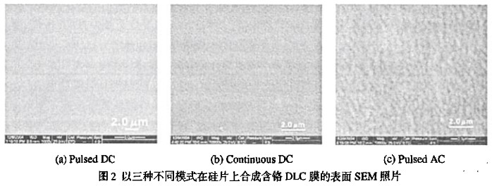 圖2顯示以三種不同模式在硅片上DLC膜的表面SEM照片,從圖中可以看出,在三種模式下合成DLC膜的表面形貌差異很大。在類似沉積條件下,脈沖模式下形成薄膜表面更加平滑,在脈沖DC模式下最為平滑。薄膜平均表面粗糙度Ra的測(cè)量值和觀測(cè)結(jié)果一致,在連續(xù)DC模式下薄膜Ra為25nm,脈沖AC模式下的是10nm,而在脈沖DC模式下的是4nm。