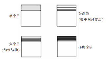涂層的內部結構變化很大程度上影響著刀具的應用效果。從涂層品種的發展上,將涂層結構分為三代:單涂層和梯度涂層(如TiN、(Ti,A1)N涂層)、多層復合涂層和納米結構多涂層(如TiAlN-ML涂層)、納米結構層和納米三合層結構涂層。總體來說,涂層結構包括單涂層、復合涂層、多涂層、納米結構多涂層、梯度涂層、復合涂層、納米復合結構涂層等類型。典型涂層結構如圖所示。