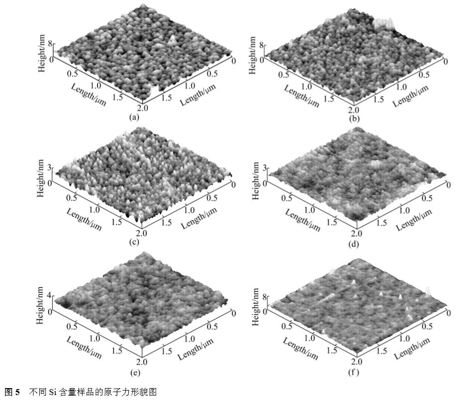 圖5所示為不同Si含量TiSiN薄膜的三維原子力顯微鏡圖。隨著Si含量的增加,薄膜的表面形貌和粗糙度(見表1)發生了明顯的改變。根據XRD和XPS結果的分析,結合所得的薄膜微觀結構可知,開始少量的Si溶入TiN晶格形成固溶體,薄膜表面仍是柱狀晶生長形成的晶粒凸起(見圖5(a)~(c)),隨著Si含量的進一步增大,形成的Si3N4非晶相的增加,附著在晶粒表面,阻礙了晶粒的進一步增大,同時填補了表面晶粒凸起間的凹坑,使得薄膜表面變得更加平滑(見圖5(d)~(f))。這與已有的研究結果一致。
