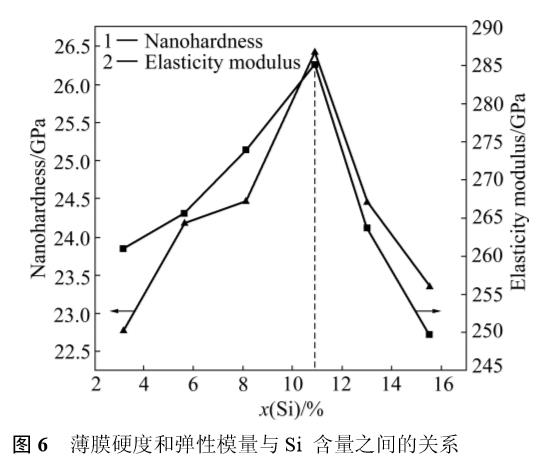 3)薄膜硬度在22~26GPa之間,基于固溶體增強效應,Si含量(摩爾分數)為10.9%時,薄膜的硬度和彈性模量均達到最大值。