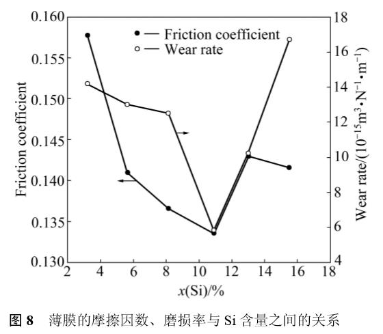 4)以Si3N4為對偶,薄膜的摩擦因數均維持在0.13~0.17之間;在Si含量為10.9%時,薄膜的摩擦因數和磨損率達到最低值。