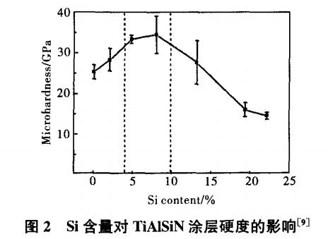 TiAlN涂層具有較好的抗氧化性和耐磨性,能有效延長刀具的使用壽命。近年來隨著高速切削和干式切削技術的發展,對刀具材料的耐磨性、熱穩定性及抗氧化性等提出了更高的要求。在高速及干式切削過程中,刀具刃口的溫度高于TiAlN涂層的抗氧化與熱分解溫度,常常導致刀具涂層氧化,硬度急劇下降。TiAlN涂層已無法完全滿足高溫下的使用要求,新涂層材料的研發迫在眉睫。近年來,許多研究者開始采用在TiAlN涂層中添加合金元素的方法來提高涂層的性能:如B元素可以提高涂層的硬度;Y、Cr元素或者少量的La元素可提高涂層的氧化溫度;Zr、V元素可提高涂層的抗磨損能力;Si元素不僅可以改善涂層的硬度與耐磨性,而且能顯著提高涂層的熱穩定性與抗氧化性。目前,TiAlSiN納米復合涂層引起了工業界的極大興趣,被認為是最新一代的超硬涂層材料,并成為國內外學者的重要目標,得到廣泛研究。