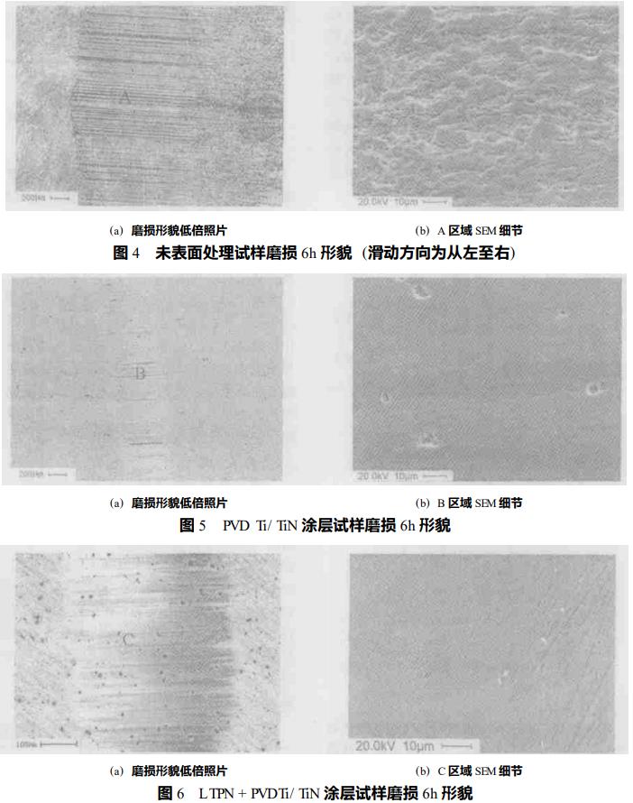 圖4、5、6是三種試樣磨損形貌的低倍照片及SEM細節,可以看出未表面處理試樣磨損形貌為典型的犁溝(見圖4a),而且高倍的SEM照片也顯示了嚴重的犁溝(見圖4b),而經表面處理的試樣磨損形貌都為非常光滑的表面,即無明顯的塑性流動、微裂紋和脆性的跡象(見圖5和圖6)。