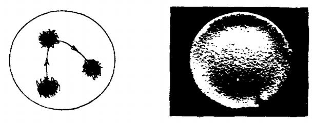 圖2是在靶面附近加一非軸對稱磁場且磁力線平行于靶面的情況下電弧放電的弧斑形貌,這種情況下弧斑亦為堆團狀,其運動是沿一個方向(與磁場方向有關),最后停留于靶面外沿一點至到滅弧。