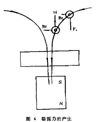 當靶面附近加一平行靶面的磁場時(參見圖2)在磁場作用下帶電粒子只受到一個方向力的作用,導致弧斑沿一個方向運動且迅速停留在靶邊沿一點,最后熄滅。