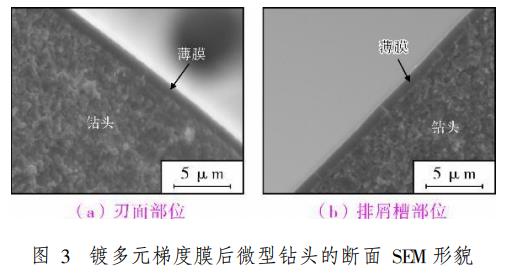 圖3為鍍多元梯度膜后微型鉆頭的斷面SEM形貌。