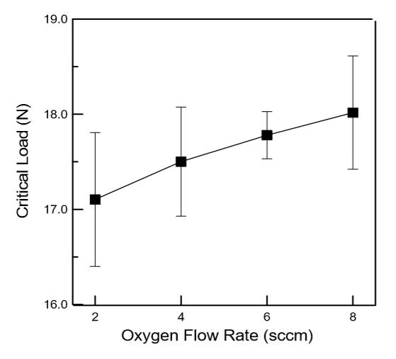隨著氧氣流量的增加,鍍層內相對壓應力隨之增加,亦可從濺鍍速率來得知。根據Kaizo等人的研究顯示,濺鍍過程中濺鍍速率的改變,會影響鍍層之內應力;在較低之濺鍍速率,亦即增加濺鍍的時間,便可增加原子或離子對鍍層錘擊(peening)作用,會使得鍍層內殘留壓應力隨之增加。在本實驗中濺鍍速率和氧氣流量的變化如圖1所示。隨著氧氣流量增加,鍍層之濺鍍速率(depositionrate)隨之降低,因此增加原子或離子對鍍層錘擊的時間,有提升壓應力之效果。