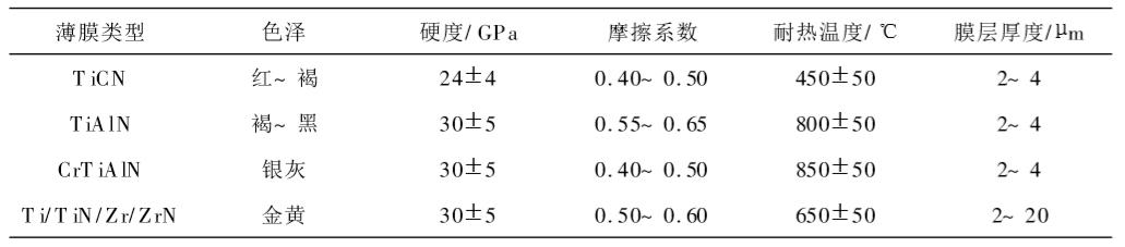 多元復合過渡金屬化合物可組合的種類非常多。表2列出了廣州有色金屬研究院制備的TiCN、TiAlN、CrTiAlN和Ti/TiN/Zr/ZrN多元多層膜的主要性能。