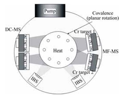 實驗在北京丹普表面技術有限公司生產的全自動控制PVD鍍膜設備ASM600DMTG上進行,設備示意圖見圖1。設備右邊為TwinMagⅡ方形中頻孿生磁控濺射靶(MFMS),左邊為兩個直流磁控濺射(DCMS)和兩個長條狀無燈絲離子源(IBS)。爐內采用加熱棒進行加熱,公自轉工件架上施加偏壓。沉積過程經過編程由電腦全自動控制。