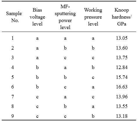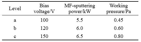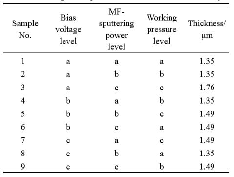 表3所列為梯度層沉積工藝調整膜層厚度的正交實驗結果。膜層厚度在偏壓a水平的均值最大,為1.49µm,c水平的最低,為1.44µm,極差為0.05;中頻功率c水平的均值最大,為1.58µm,a水平的最低,為1.39µm,極差為0.18;工作壓強c水平的均值最大,為1.58µm,a水平的最低,為1.39µm,極差為0.18。中頻功率和工作氣壓對厚度的影響相對顯著。采用高中頻功率和高工作氣壓的樣品厚度均在1.5µm左右,平均沉積速率為18nm/min。Cr層沉積時間最長僅為3min,Cr層沉積工藝的調整對膜層厚度的影響很小。