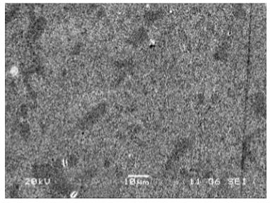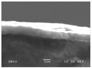 圖2所示為模具鋼上膜層的掃描電鏡表面形貌。可見表面致密均勻,基本上無液滴顆粒。所有鍍膜大片不銹鋼樣品均無麻點出現,表面光潔,呈銀色鏡面狀。圖3所示為膜層的截面形貌,可見膜層厚度均勻一致,約為1µm厚。采用矩形靶結合無燈絲離子源技術,保證了大面積膜層表面質量及厚度的均勻。