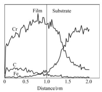 圖4所示為采用電子能譜(EDS)對膜層截面中的C、Cr、N、Fe元素進行線掃描的結果。由膜層表面向基底讀譜:膜層成分呈漸變分布,C元素相對強度保持到距表層0.5µm處才開始下降,Cr元素在0~1µm處相對強度單調上升,Cr元素與Fe元素在基底與膜層邊界處相對強度漸變,形成良好的過渡區。譜中金屬Cr元素的電子能譜強度較非金屬的高。如表面Cr和C鍵合狀態一定,深入膜層則C與Cr相對強度變化趨勢相同。圖中距表層0.5µm處C強度下降而Cr強度升高,Cr強度升高應歸因于來自CrCN\CrN中的Cr。圖譜中N應處于距表層0.5~1µm之間,由于檢測方法所限,EDS譜中的N元素由于不敏感而不易測出。由于Fe與Cr良好的相溶性,圖譜中界面處Fe和Cr含量漸變,Cr界面層的沉積有效地提高了附著性能。
