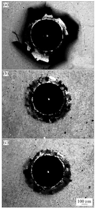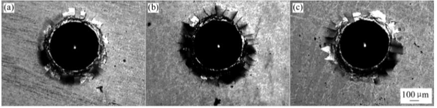 由極差值判斷,Cr層沉積的時間影響最顯著,其次為輔助離子源電流,中頻功率的最小。Cr層正交實驗的極差值遠大于梯度層,說明界面的結合狀態及結構是附著力的主要決定因素。合適的金屬Cr層可有效提高膜層附著力。采用劃痕儀的聲納信號表征附著強度時,不可避免地會受到基底表面狀況、膜層脆性及外部環境的影響。實驗通過掃描電鏡分析對比了劃痕及壓痕的形貌。根據正交分析結果,梯度層沉積工藝中偏壓對附著性能的影響最大,真空度的影響最小。圖5所示為相同中頻功率、不同偏壓下制備的樣品劃痕形貌。由圖可見,樣品6最先出現膜層剝落,其次為樣品3;隨著載荷增大,3條劃痕均出現膜層裂紋擴展變小。這可能是由于表面的CrC是脆性的,載荷增大劃痕壓頭深入膜層,CrN層承載大部分載荷所致。圖6所示為對應的Rockwell-C壓痕。由圖可見,樣品9膜層裂紋擴展半徑最小,壓痕圓周界面脫膜最少,根據標準分級為HF3,樣品3和6均為HF4,但可明顯看出樣品3的裂紋擴展半徑較小些。由劃痕和壓痕對比,它們對附著性能的判斷與正交分析結果一致。梯度層沉積工藝對附著性能的影響較小。圖7所示為離子源電流相同、不同Cr層沉積時間的3個樣品12、15、18的劃痕形貌。由圖可見,樣品15膜層末脫落的痕跡最長,而樣品12的最短且其膜層脫落擴展明顯大于另外兩個樣品??梢姡〉腃r層不利于改善附著性能。圖中仍出現了裂紋收縮的現象。圖7中3條劃痕的差異較圖5的大,表明Cr層沉積對附著性能的影響較大。由于Cr層沉積時間與離子源功率極差值較大,圖8比較了同離子源電流、不同Cr層沉積時間下制備的樣品12、15、18的壓痕形貌。由圖可明顯地看出附著性能的差異,樣品15分級為HF2,樣品18為HF3,樣品12為HF5。厚金屬層會惡化附著性能,而高功率離子源電流輔助沉積則可改善其附著性能。由壓痕可知,Cr層沉積時間與離子源電流仍為影響附著性能的主要因素,但最優結果為樣品15,與正交分析和劃痕結果不同。這種差異的出現可能與兩種測試方法有相關,劃痕在劃動過程中存在動運,對于應用中的滑動部件,其結果與膜層摩擦因數等相關;而壓痕則由上往下壓,對應沖壓部件,其結果更多依賴于膜層的脆性。在實際研究中可根據實驗情況選擇測評方法。與劃痕的對比相同,圖8中Cr層實驗的壓痕差異較明顯,進一步證明Cr層工藝調整對膜層附著性能影響顯著。