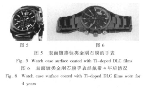 圖6為表面鍍類金剛石膜的手表經實際佩帶4年后的外觀情況。經高級研發人員實際佩帶4周年后,該手表表面除了正常的摩擦引起的個別較深劃痕以外,沒有出現大面積的磨損和掉膜現象。表面膜層保護效果良好。