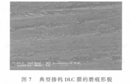 典型的DLC膜磨損形貌如圖7所示,從圖7可以看出,磨痕表面存在明顯的犁溝和膜層內(nèi)部的微觀斷裂。犁溝主要是由于基體硬度低,在磨損過程中DLC膜底部的不銹鋼基體在對(duì)摩副壓入時(shí)發(fā)生塑性變形引起的;在基體發(fā)生塑性變形時(shí),變形區(qū)域上的DLC膜產(chǎn)生斷裂和剝離現(xiàn)象,能譜分析發(fā)現(xiàn)犁溝底部的化學(xué)組成主要是碳和鎢,這表明摻鎢DLC膜在磨損過程中并沒有發(fā)生直抵基體的大面積剝落現(xiàn)象,僅僅發(fā)生了梯度摻鎢DLC膜內(nèi)部微觀斷裂和不同亞層之間的剝離。