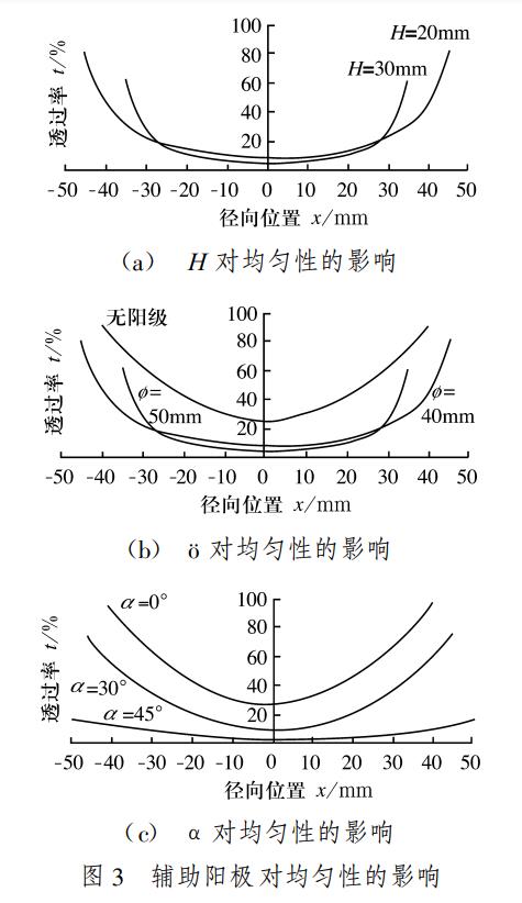 在陰極直徑為ö17.5mm,輔助陽極的基本尺寸為高度30mm、內徑40mm、內孔錐度45°的情況下,分別改變輔助陽極高度H、內徑ö、內孔錐度α進行鍍制實驗。從圖3可見,輔助陽極對鍍膜均勻性有影響,但無論采用那種情況所鍍制的膜層,它們的透過率相對變化在ö60mm范圍內都已超過±10%。