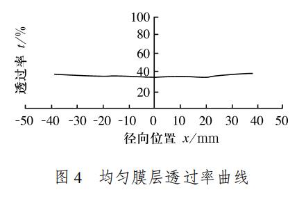 實驗在各工藝參數即主回路電壓、起弧回路的電壓和電容、頻率和真空度不變的條件下,改變脈沖真空電弧離子源電極幾何尺寸,主要通過改變陰極(起弧極與陰極是配套的)和輔助陽極的幾何尺寸來研究對膜厚均勻性的影響。這里用膜層透過率的相對變化來表征膜厚均勻性,其具體的計算公式為