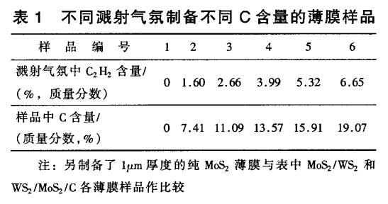 將用于摩擦性能測試的Φ30mm不銹鋼基片和用于成分和結構分析的單晶硅片經丙酮和無水酒精超聲波清洗并烘干,裝入真空室內。真空室的本底真空控制在3X10-4Pa數量級。采用氬氣和乙炔氣體為工作氣體,通過調整濺射氣氛中的乙炔含量來制備不同含碳量的復合薄膜,濺射氣壓為0.3Pa,濺射功率為150W,薄膜厚度約1um左右。不同濺射氣氛下制備的不同碳含量的樣品見表1所示。作為比較,在相同條件下制備厚1um左右的純MoS2薄膜。為了提高基底與薄膜間的結合力,鍍膜前在基底上預沉積一層厚約50nm的金屬Ti過渡層。