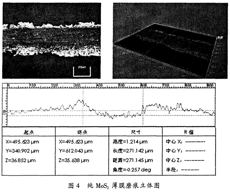 使用真彩色高分辨率的共聚焦顯微鏡的立體成像功能,對被磨穿的純MoS2薄膜磨痕情況進行立體分析,如圖4,由磨痕處測得該薄膜厚度1.214um。