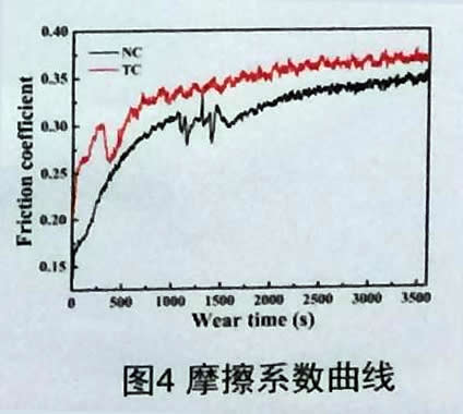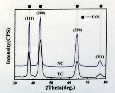 CrN相有(111)、(200)、(220)和(311)方向的衍射峰。NC所有衍射峰相比于TC的衍射峰整體變強,說明新型離子清洗技術有效提高了CrN相的結晶度。物相檢測中未檢測出AlN相是因為Al原子以固溶物的形式存在于面心立方的CrN相中。