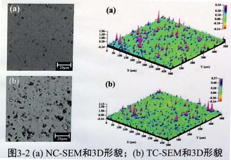 NC涂層的表面粗糙度為127.5±17nm,TC涂層的表面粗糙度為194.6±20nm。(a)中表面顆粒分布均勻,Ht為0.58微米;(b)中涂層表面大小顆粒分布集中區域明顯,Ht為0.91微米。采用新型離子清洗技術制備的涂層表面粗糙度和顆粒尺寸明顯低于傳統清洗工藝。