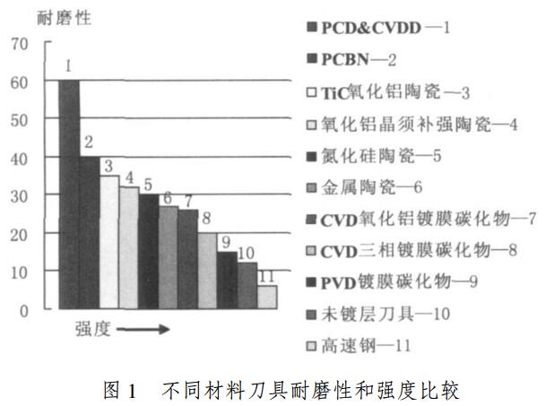 根據(jù)材料的耐磨性和強(qiáng)度,給出了各種刀具材料排序的結(jié)果,如圖1所示。可以看出,金剛石尤其是以純單晶形式存在的金剛石耐磨性最高。但是由于它具有解理面,在受沖擊時(shí)往往會(huì)表現(xiàn)出脆性,容易被破壞,在所有材料中強(qiáng)度最低。PCBN表現(xiàn)出比傳統(tǒng)的刀具材料如陶瓷更優(yōu)良的性能,其耐磨性僅次于金剛石材料,強(qiáng)度同陶瓷接近,但耐磨性比PCD要差。PCBN在切削耐磨材料中耐磨性分別為硬質(zhì)合金刀具的50倍,涂層硬質(zhì)合金刀具的30倍,陶瓷刀具的25倍。