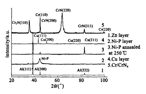 (2)采用特殊的預處理和過渡層工藝,形成Zn/Ni/Cu/cr/CrN的梯度多層膜,性能梯度分布,結(jié)構(gòu)交替變化,能夠有效地解決鋁合金上鍍硬質(zhì)陶瓷膜的熱適配和晶格錯配度大的難題,提高了鋁合金上CrNx涂層的結(jié)合力。